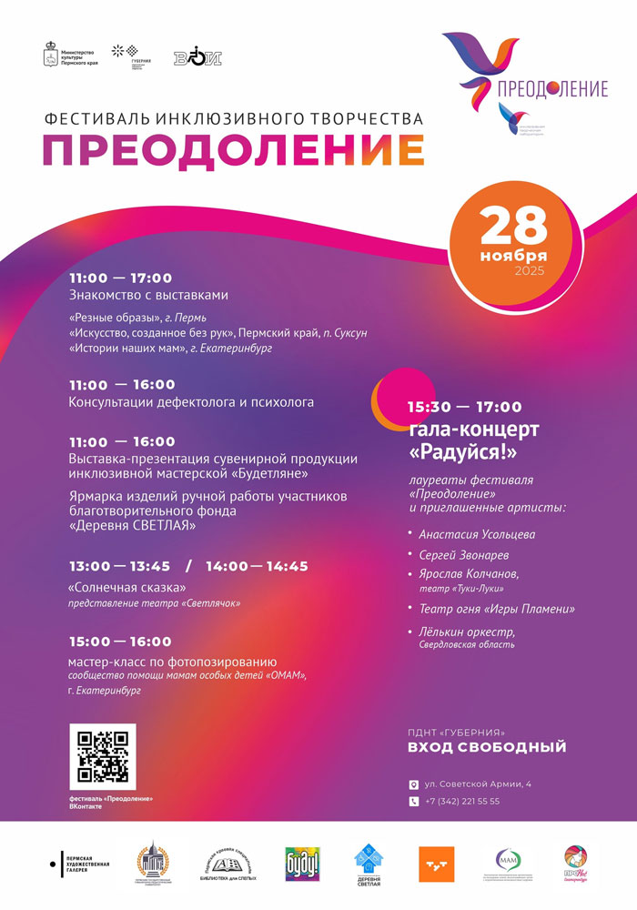 «Преодоление» – это крупнейшее инклюзивное событие Пермского края, способствующее самореализации людей с ограниченными возможностями здоровья, а также трансляции успешных практик по работе с инклюзией в учреждениях культуры, развитию инклюзивного сообщества в регионе. В рамках фестиваля организуется как конкурсная, так и деловая программа, в которой участвуют специалисты ведущих учреждений культуры России в области инклюзии.